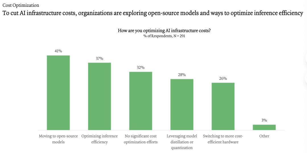 虽然OpenAI的GPT系列模子仍然最受欢送,大大都公司正正在权衡内部AI利用的出产率提拔和成本节约,部门企业更倾向采用开源模子,大都受访企业采用OpenAI模子搭配1-2个其他供应商模子的组合策略。